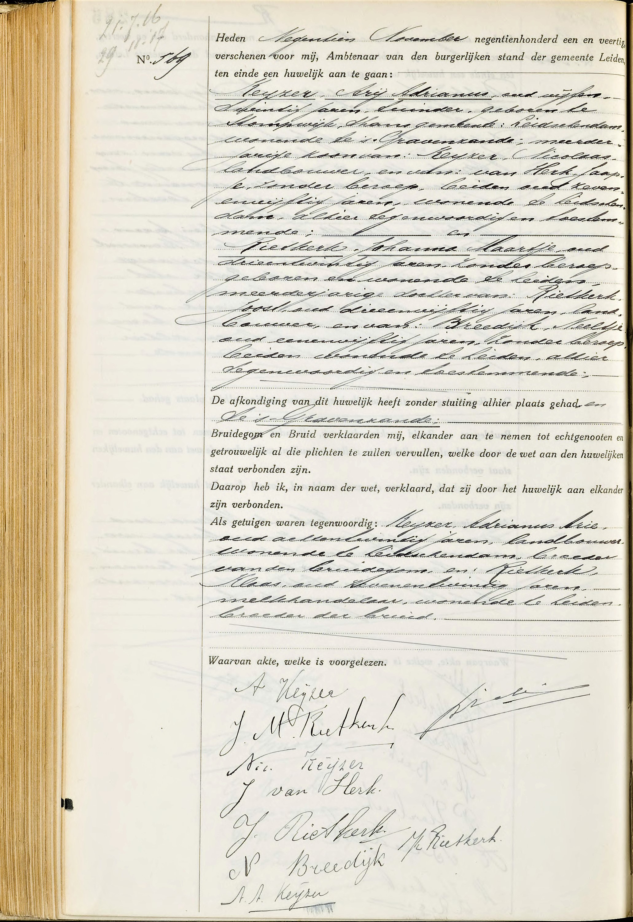 Huwelijksakte Klaas Rietkerk en Maria Treur, 03-12-1942, Leimuiden