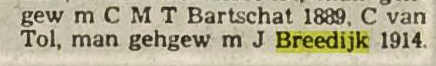 2508. Bastiaan "Bas" BREEDIJK [scrapbook]-4887 (Jan BREEDIJK , Jan BREEDIJK , Jan BREEDIJK , Jan BREEDIJK , Leendert BREEDIJK , Wouter Jansz BREDIJK , Jan Gerritsz BREDIJCK , Gerrit Cornelisse BREEDIJK , Cornelis Gerritse , Gerrit ) was born on 11 Apr 1907 in Zevenhuizen. He died on 31 Dec 1974. He was buried on 4 Jan 1975 in Moerkapelle, Alg..