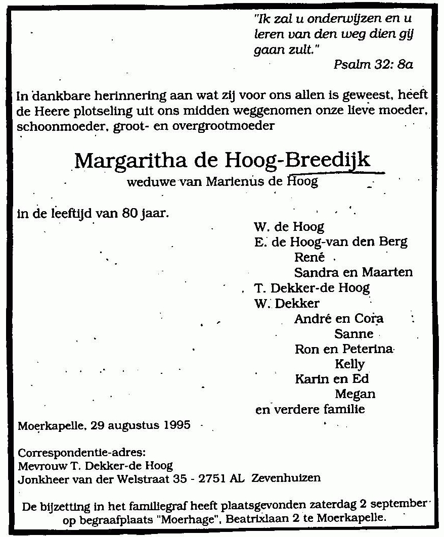 2511. Margaretha "Gré" BREEDIJK [scrapbook]-6780 (Jan BREEDIJK , Jan BREEDIJK , Jan BREEDIJK , Jan BREEDIJK , Leendert BREEDIJK , Wouter Jansz BREDIJK , Jan Gerritsz BREDIJCK , Gerrit Cornelisse BREEDIJK , Cornelis Gerritse , Gerrit ) was born on 25 Jan 1915 in Zevenhuizen. She died on 29 Aug 1995 in Moerkapelle. She was buried on 2 Sep 1995 in Moerhage, Moerkapelle. |