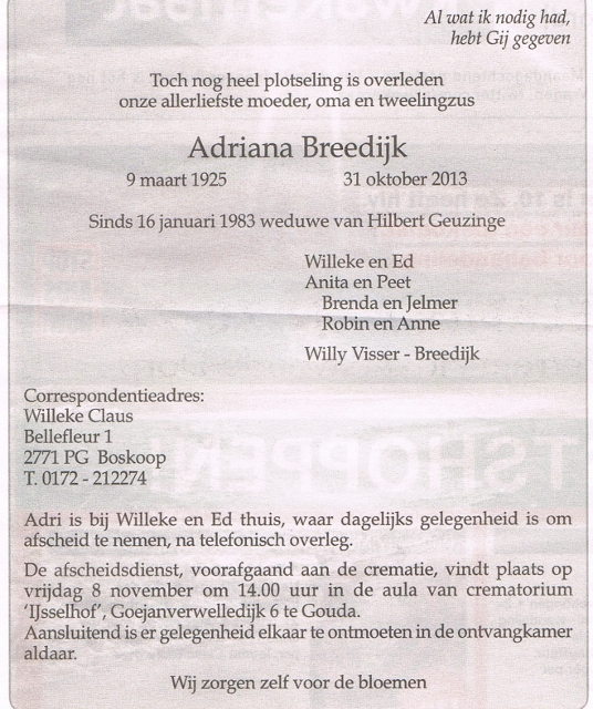 2517. Adriana "Adri" BREEDIJK [scrapbook]-7454 (Jan BREEDIJK , Jan BREEDIJK , Jan BREEDIJK , Jan BREEDIJK , Leendert BREEDIJK , Wouter Jansz BREDIJK , Jan Gerritsz BREDIJCK , Gerrit Cornelisse BREEDIJK , Cornelis Gerritse , Gerrit ) was born in 09 Mrt 1925 in Zevenhuizen. She died in 31 Okt 2013. She was buried on 8 Nov 2013 in Gouda, Crematorium "IJsselhof". |