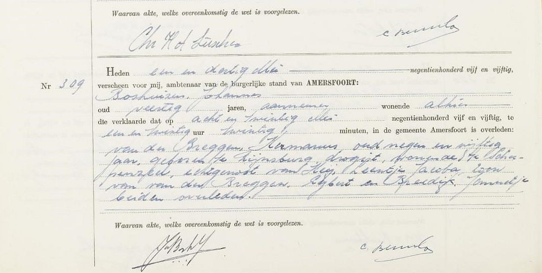 | Overlijdensakte Hermanus van der Breggen in Amersfoort |