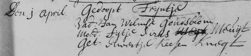 + 228 M i Dirk Willems MUIJT-9374 was christened on 21 Aug 1719. He was buried on 2 Jul 1772. + 229 F ii Stijntje Willems MUIJT-9352 was christened about 1721. She was buried in 13 Mrt 1795. + 230 F iii Cornelia Willems MUIJT-9375 was born on 8 Jan 1724. She was buried on 1 Nov 1775. + 231 F iv Aaltje Willemsdr MUIJT-9376 was born on 24 Jun 1725. She was buried on 1 Nov 1809.