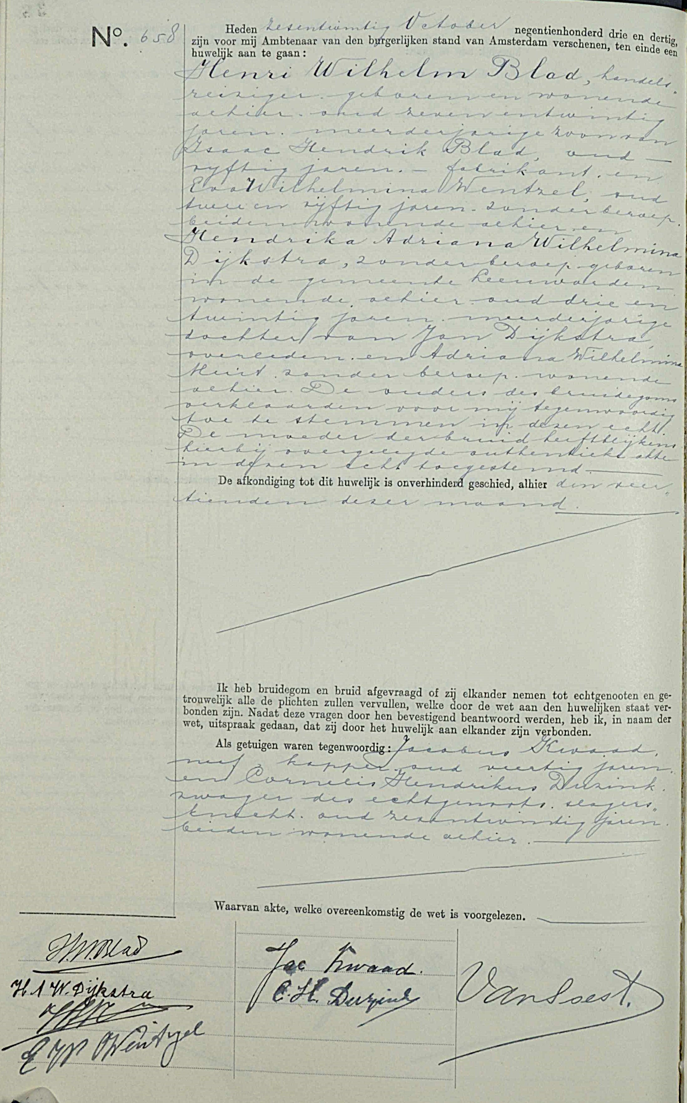Huwelijksakte Henri Wilhelm Blad en Hendrika Adriana Wilhelmina Dijkstra