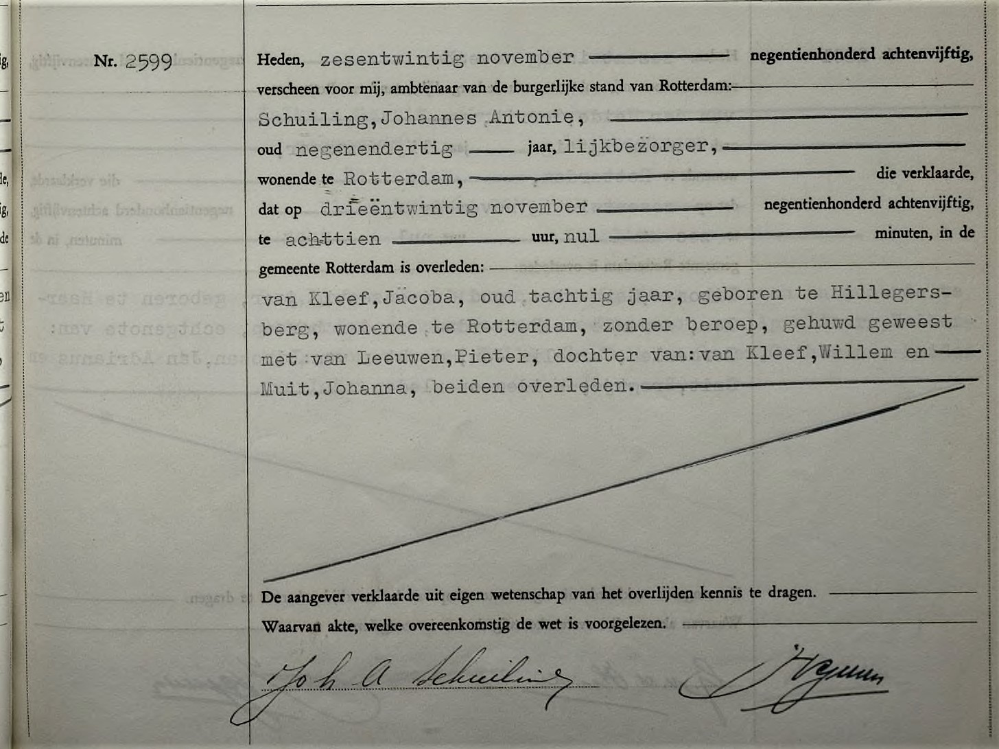 Geboorteakte Jacoba van Kleef in Hillegersberg